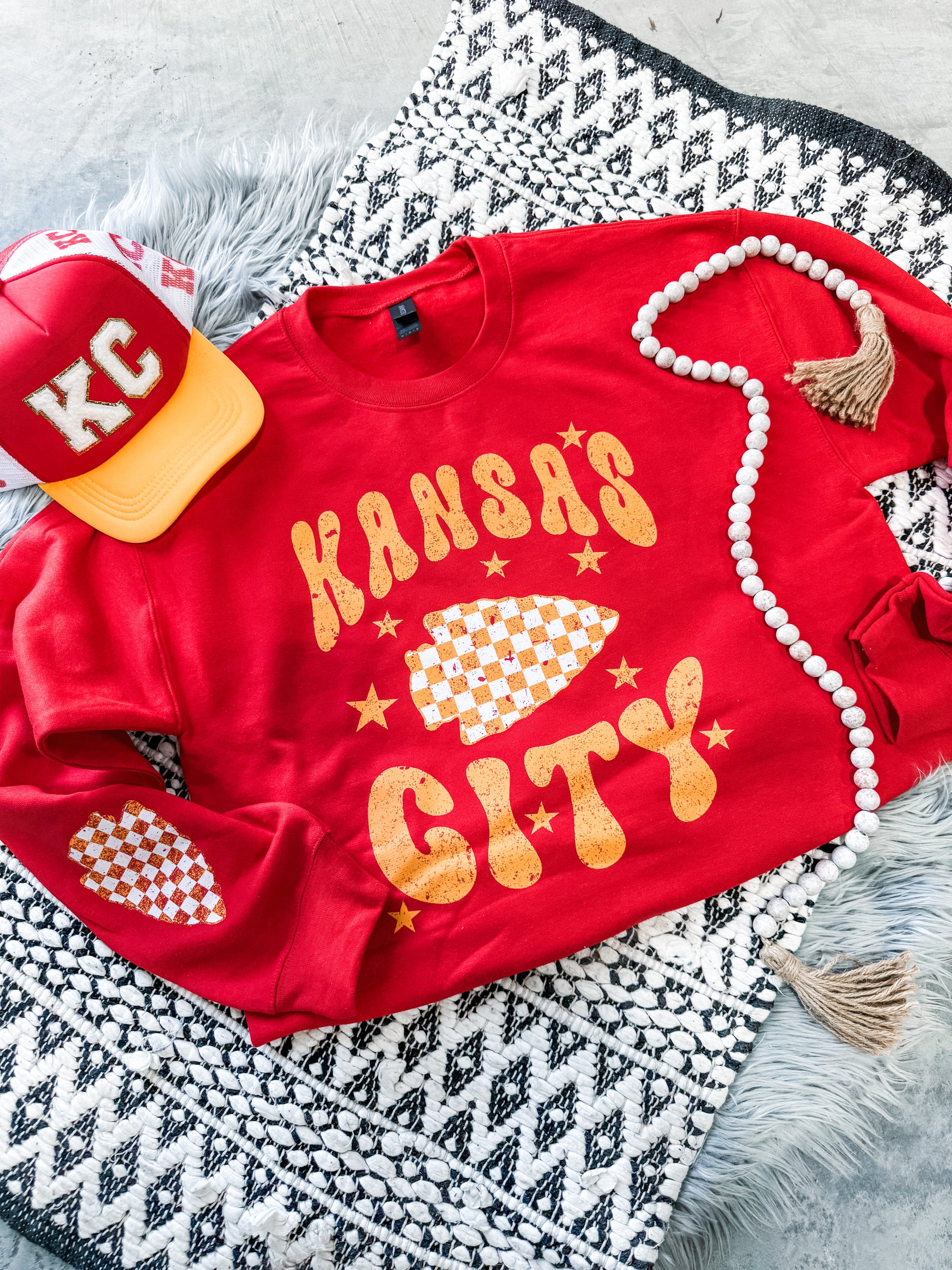 Kansas City Retro Checkered Arrow & Distressed Checkered Arrow Sleeve Red Sweatshirt