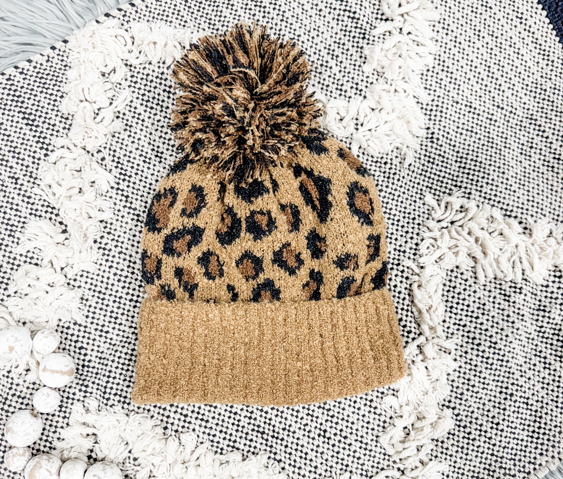 Latte Leopard Pom Pom Beanie